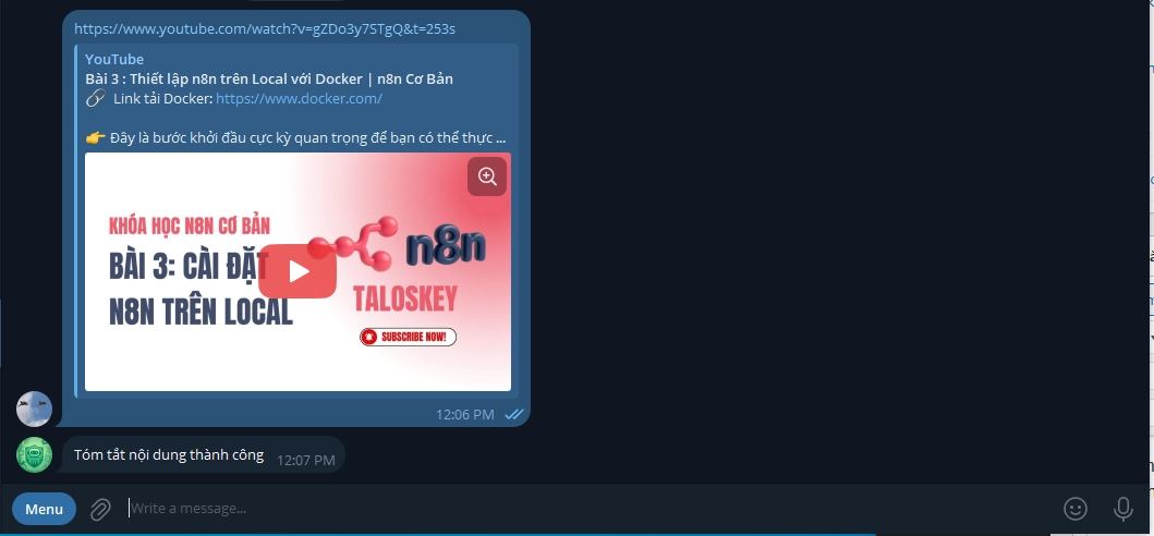 - Tự lấy nội dung video: Bot trích xuất nội dung (transcript) từ video và lưu cả link + nội dung vào Google Sheets.